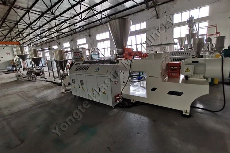 У 2024 році ми розробили спеціальну машину для гранулювання ПВХ-компаунду для польського клієнта, спеціально розроблену для виробництва гранул ПВХ-маткової суміші з переробленого ПВХ і наповнювача CaCO₃. Вміст наповнювача CaCO₃ можна гнучко регулювати від 40% до 80% відповідно до виробничих специфікацій замовника. Ключові компоненти включають автоматичну подачу, конічний двошнековий екструдер SJSZ80/156 (двигун потужністю 75 кВт з частотним інвертором ABB, споживаючи ~50 кВт під час стабільної роботи), матрицю гарячого гранулювання для рівномірного різання гранул і триступеневу систему швидкого повітряного охолодження та транспортування з нержавіючої сталі 304. Машина досягає виробничої потужності 300-400 кг/год і створена для безперервної роботи 24/7 без простоїв. Встановлення пройшло без проблем за підтримки команди експертів Yongte, яка надала повну допомогу. Навчання на місці після інсталяції дало змогу персоналу клієнта кваліфіковано працювати з обладнанням, а дистанційна технічна підтримка за допомогою відеоінструкцій забезпечила оперативне вирішення будь-яких проблем, підтримуючи безперебійне виробництво та максимальну продуктивність.