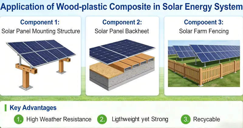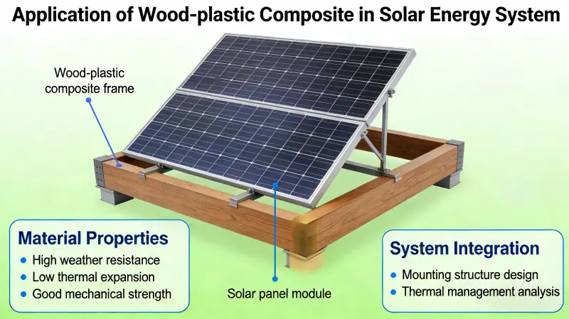 Дерево-пластикові композити еволюціонували від допоміжних матеріалів до основних структурних і функціональних матеріалів у сонячних енергетичних системах, демонструючи значні переваги в фотоелектричних монтажних системах, плавучих електростанціях і будівництві інтегрованої фотоелектричної системи (BIPV). З майбутнім прогресом в області оптимізації рецептури, структурних інновацій і зниження вартості їх застосування буде розширюватися, позиціонуючи їх як один із ключових матеріалів для екологічних, низьковуглецевих і довговічних систем сонячної енергії.