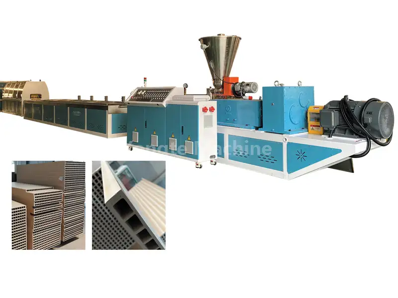 Спеціально розроблений конічний двошнековий екструдер може ефективно транспортувати суміші деревного борошна та смоли ПВХ, швидко пластифікувати матеріали, щоб уникнути карбонізації деревного борошна або деградації ПВХ, підвищити ефективність виробництва та зменшити споживання енергії. Він оснащений серводвигуном для зменшення споживання електроенергії на 15-20%, вертикальною коробкою передач з прямим приводом з високою ефективністю трансмісії та стабільною роботою, довговічною та енергоефективною автоматичною системою нагріву та контролю температури.